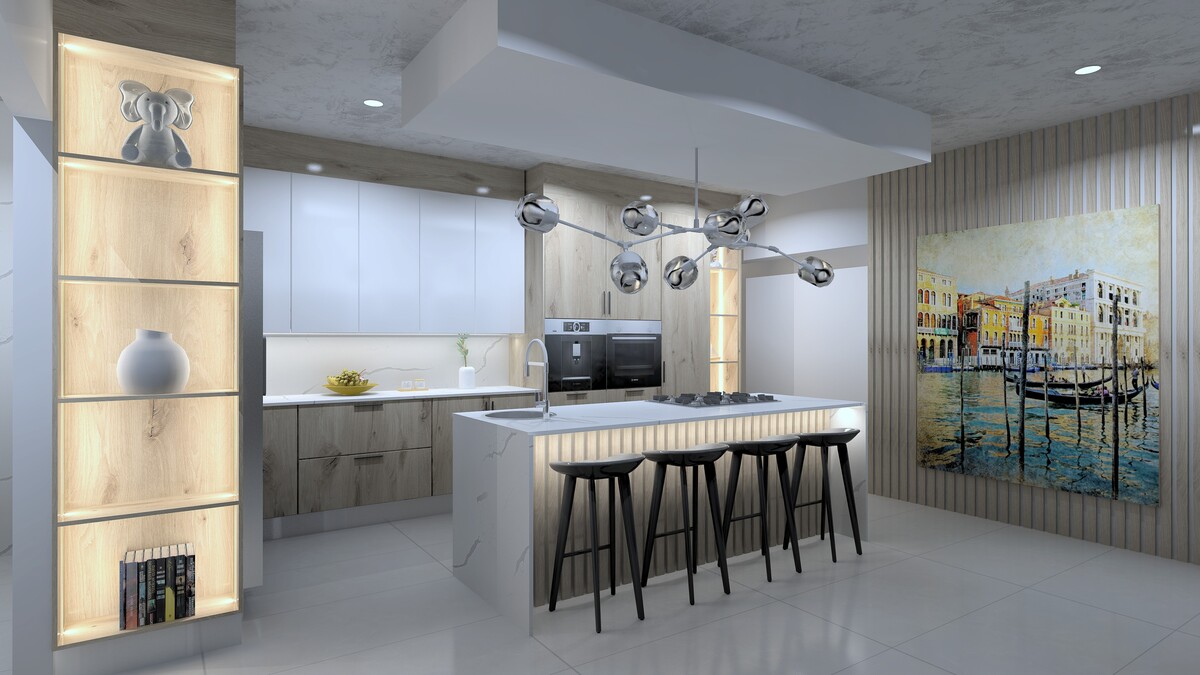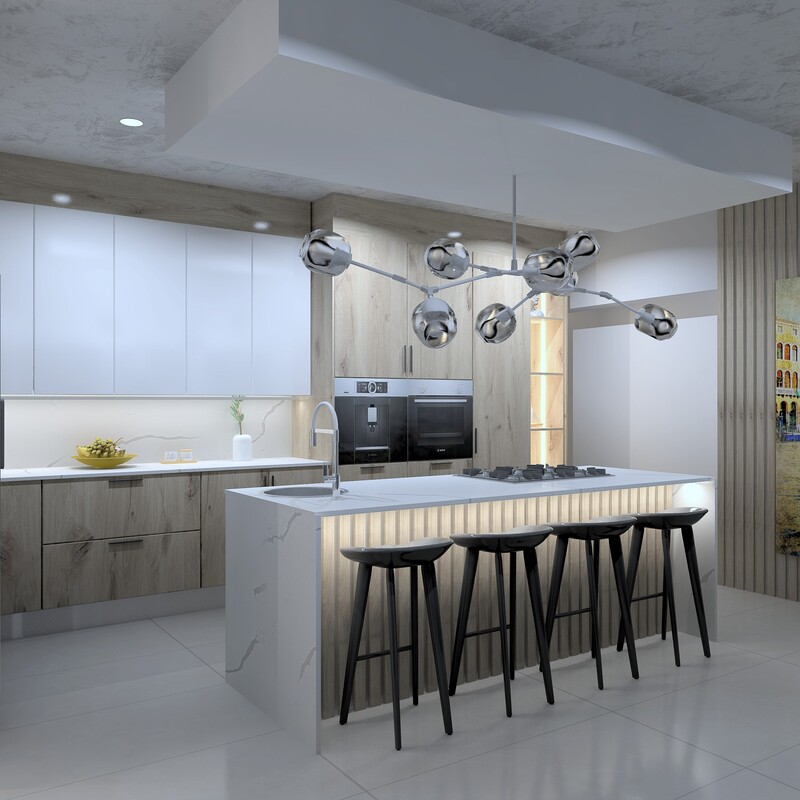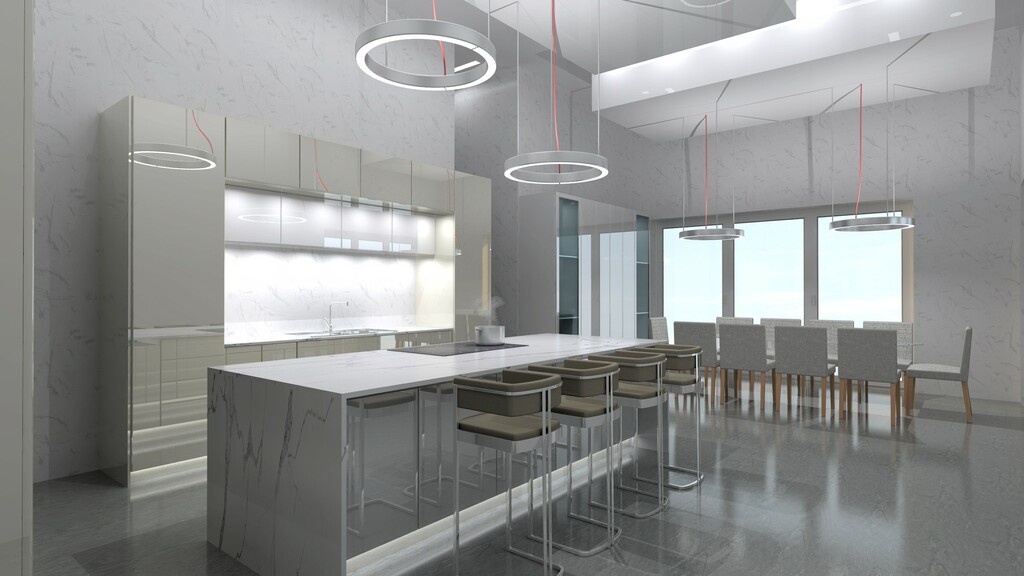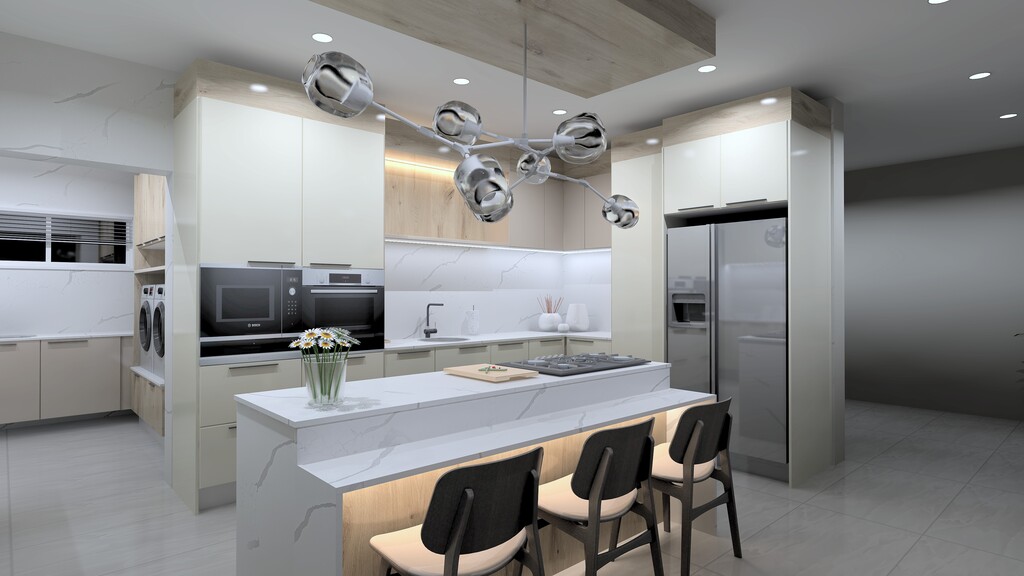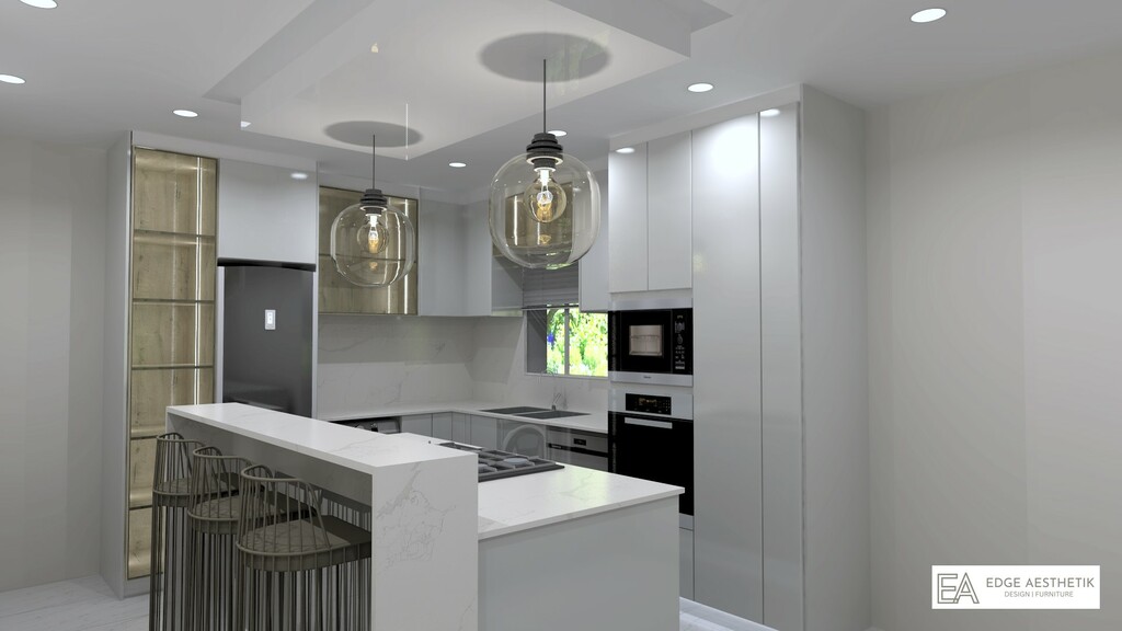 Modern kitchen architecture with premimium finishes. Kitchen area is an open plan which includes a dining area. This allows for family bonding time over breakfast, lunch and dinner.