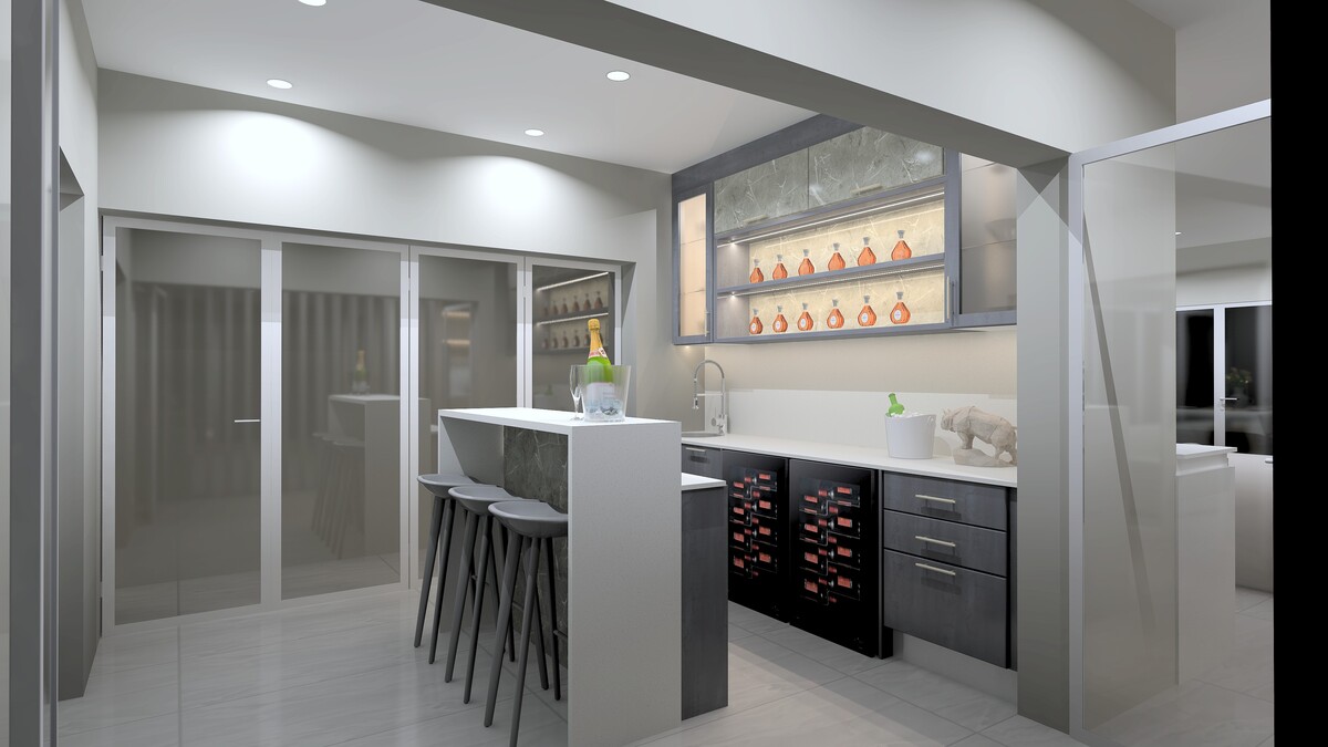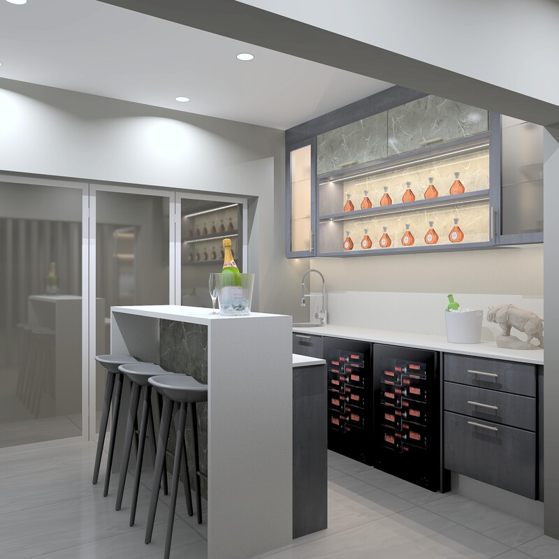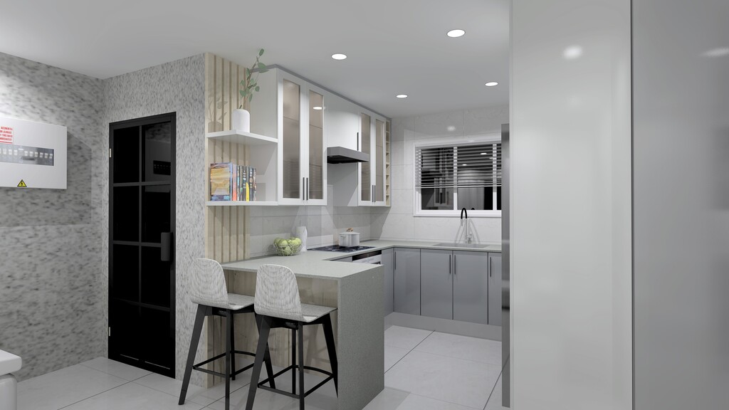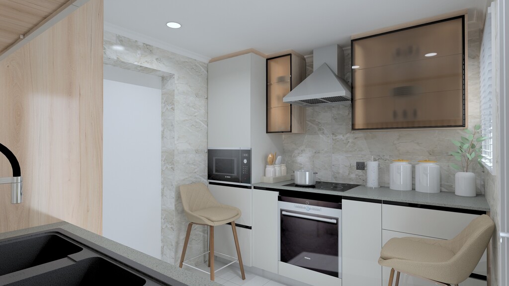 Kitchen renovation proposal, practical space with all functional elements with a touch of premium. Glass wall units and breakfast nook with additional floor cabinets