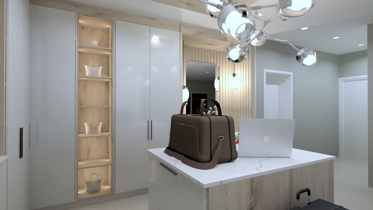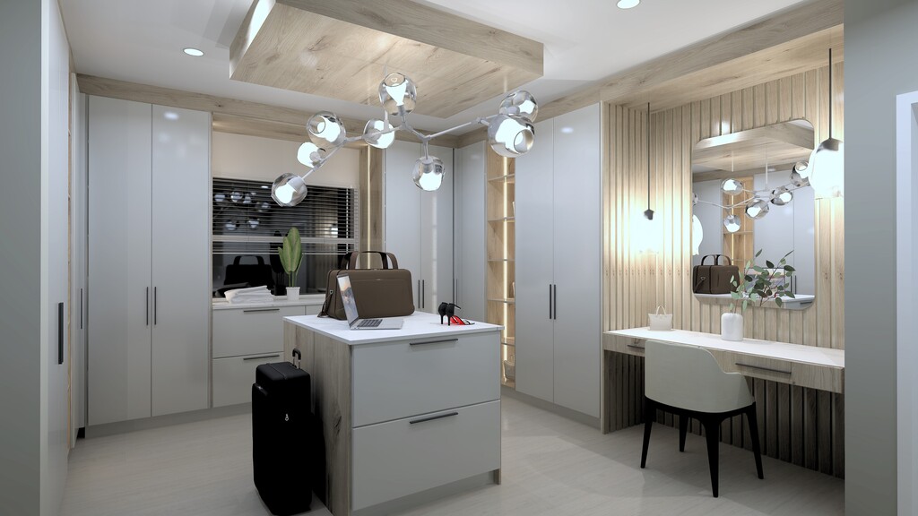 Main bedroom interior design with walk-in closet and custom make-up dresser unit. High end finishes and aluminium glass doors and led lighting. Functional space with his and hers sections
